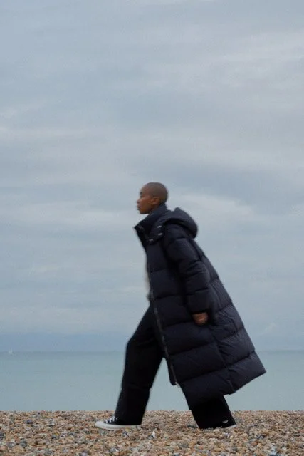 Person wearing black puffer coat and black pants walking on a pebble beach with a gray cloudy sky background.