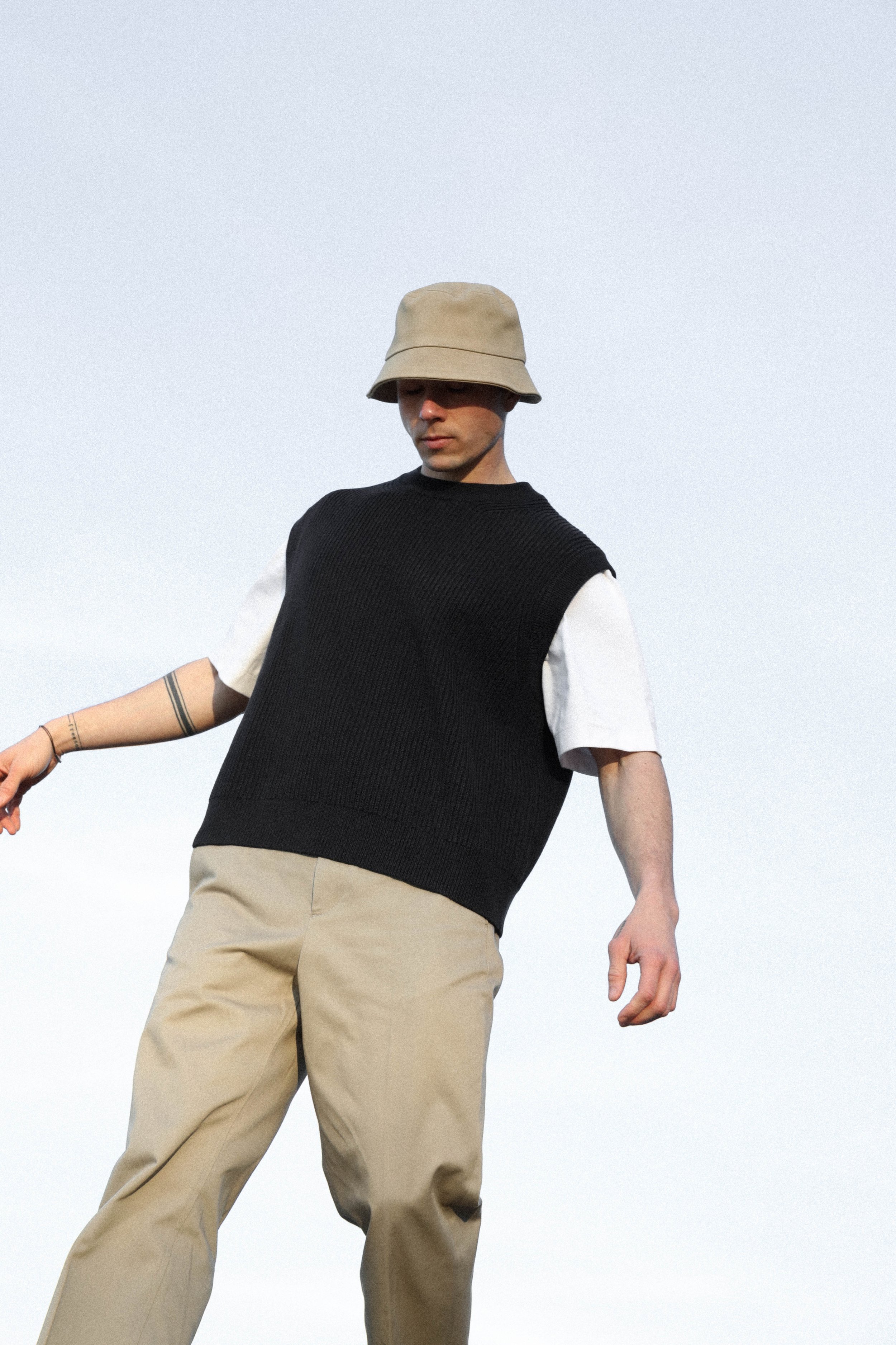 A young man wearing a beige bucket hat, a white T-shirt, a black knitted vest, and beige pants standing outdoors against a clear sky.
