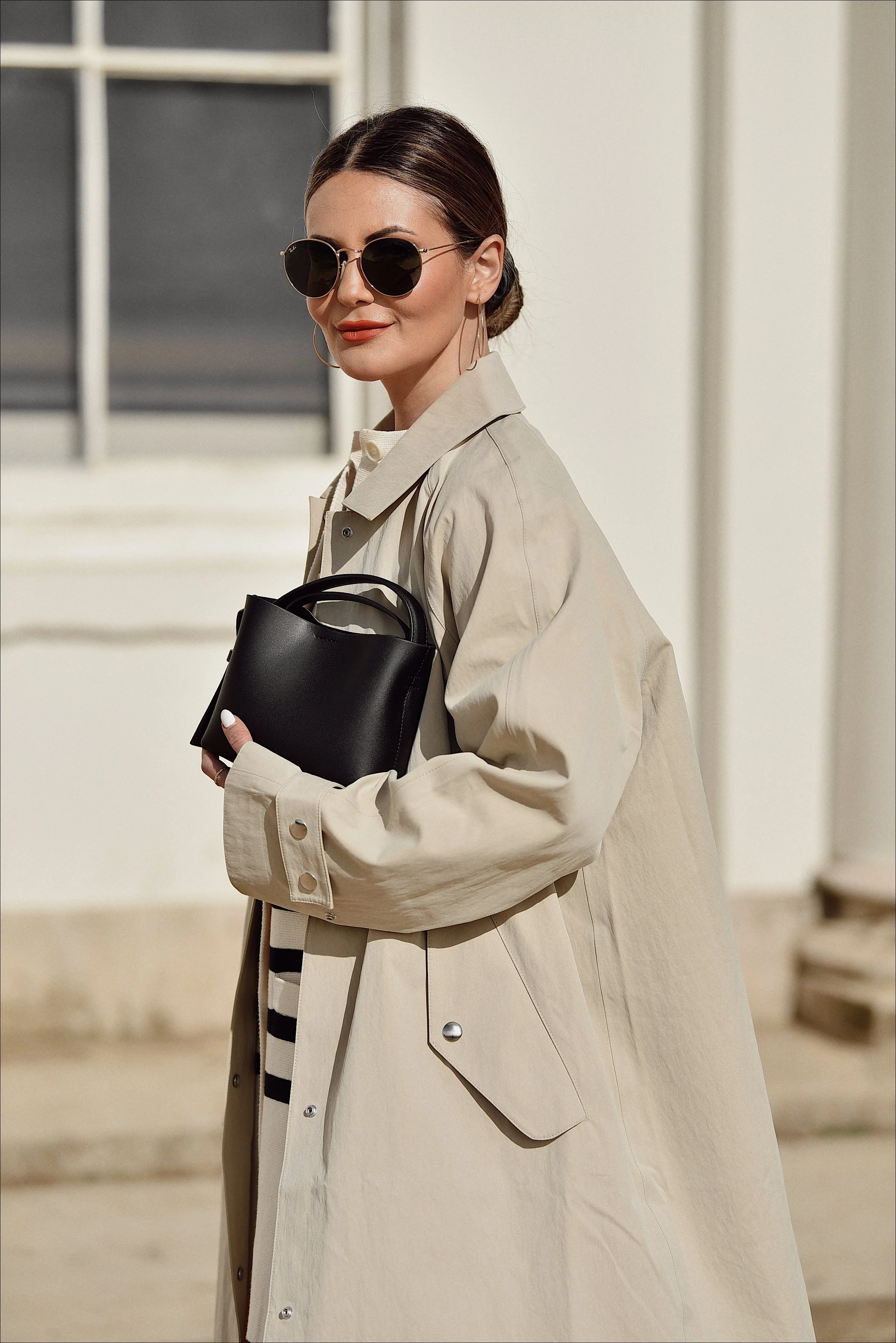 A woman with dark hair styled in a bun wearing large round sunglasses and hoop earrings, dressed in a beige trench coat, holding a black handbag, standing outdoors in front of a building with white walls and windows.